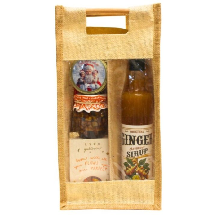 Praktická, pekná a nadčasová jutová taška so skvelými produktmi vo vnútri.