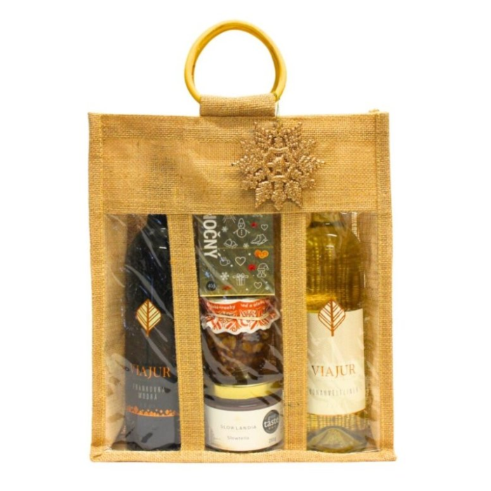 Praktická, pekná a nadčasová jutová taška so skvelými produktmi vo vnútri.