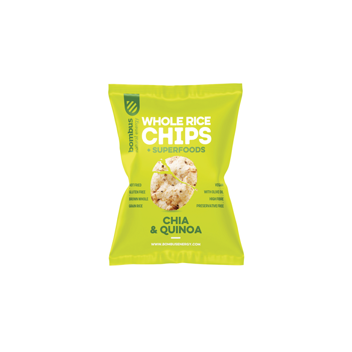 Pečené ryžové chipsy vyrobené z hnedej celozrnnej ryže obohatené o chia semienka a quinou. Hnedá ryža je skvelým zdrojom selénu, fosforu, horčíka, mangánu, železa, zinku, vitamínov B1, B3, B6 a kyseliny listovej. Hnedá ryža vzniká odstránením iba tej najvrchnejšej vrstvy z ryžového zrnka, ďalšia hnedá časť šupky, bohatá na vitamíny skupiny B a minerály, zostáva. Oproti bielej ryži je preto hnedá ryža výrazne nutrične hodnotnejšie a zdravšie. Radí sa medzi celozrnné potraviny a obsahuje spousty zdraviu prospešných minerálnych látok a vitamínu.