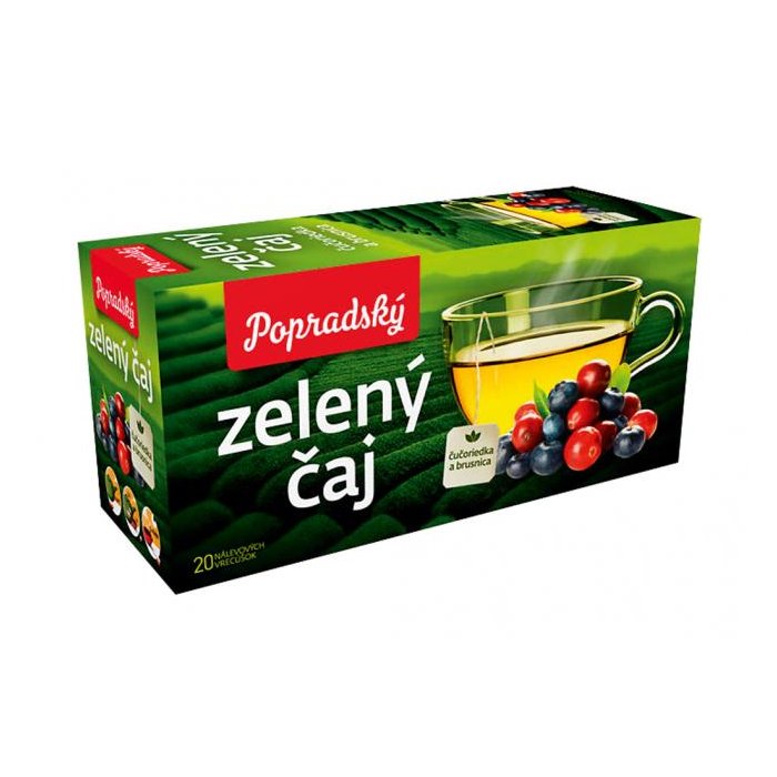 Aromatizovaný zelený čaj s príchuťou čučoriedka a brusnica, porciovaný v nálevových vreckách.