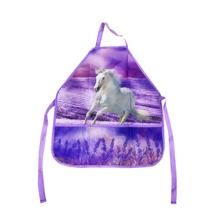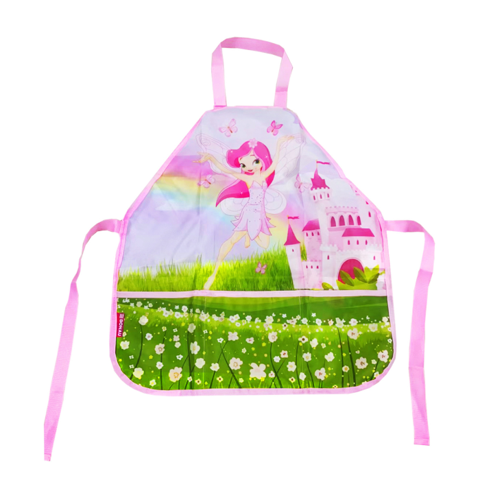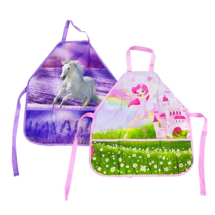 Detská zástera na maliarske a tvorivé potreby, 2 rôzne vzory, veľké predné vrecko s 3 vreckami na maliarske a tvorivé potreby, zapínanie na suchý zips pri krku a zaväzovanie vzadu, vrátane menovky, materiál polyester, univerzálna veľkosť 54x46cm