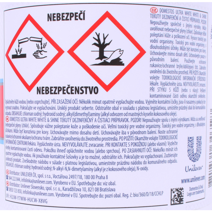 DOMESTOS ULTRA WHITE POZOR! Nepoužívajte spolu s inými výrobkami. Môžu sa uvoľňovať nebezpečné plyny (chlór). Spôsobuje vážne poleptanie kože a poškodenie očí. Veľmi toxický pre vodné organizmy. Môže byť korozívna pre kovy. Uchovávajte mimo dosahu detí. Uchovávajte iba v pôvodnej nádobe. Zabráňte uvoľneniu do životného prostredia. Noste ochranné rukavice/ochranný odev/ochranné okuliare/ochranu tváre. PRI KONTAKTE S POKOŽKOU (alebo vlasmi): Všetky kontaminované časti odevu okamžite vyzlečte. Pokožku opláchnite vodou/sprchou. PO ZASIAHNUTÍ OČÍ: Niekoľko minút ich opatrne vyplachujte vodou. Ak používate kontaktné šošovky a ak je to možné, odstráňte ich. Pokračujte vo vyplachovaní. Okamžite volajte TOXIKOLOGICKÉ INFORMAČNÉ CENTRUM/lekára. Zozbierajte uniknutý produkt. OBSAHUJE: chlórnan sodný; hydroxid sodný; N-alkyl-N,N-dimetylamíny (alkyl je z kokosového oleja), N-oxidy.
