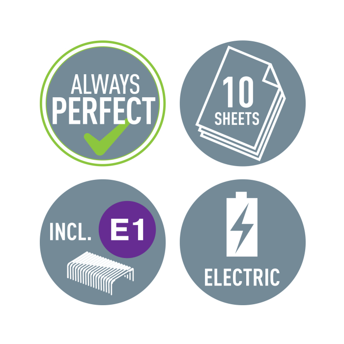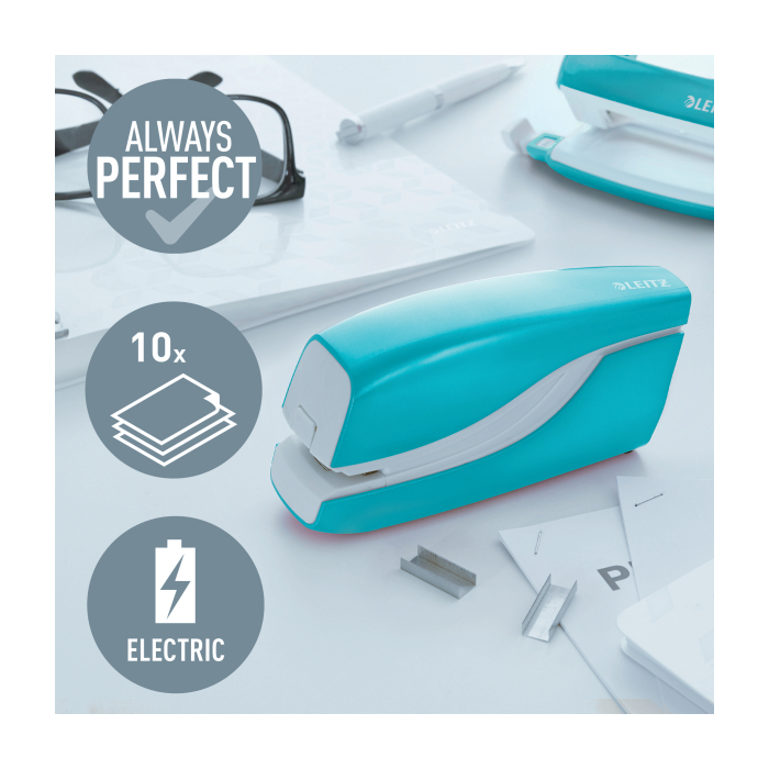 Elektrická zošívačka Leitz New NeXXt WOW. Vďaka jednoduchému ovládaniu jednou rukou je ideálna na časté používanie. Technológia s napájaním na batérie na zošívanie v pohybe. V žiarivých farbách WOW. Batérie (4× 1,5 V AAA LR03) nie sú súčasťou balenia. Kapacita 10 listov. Náhradné spinky ES556800. Farba ľadovo modrá.