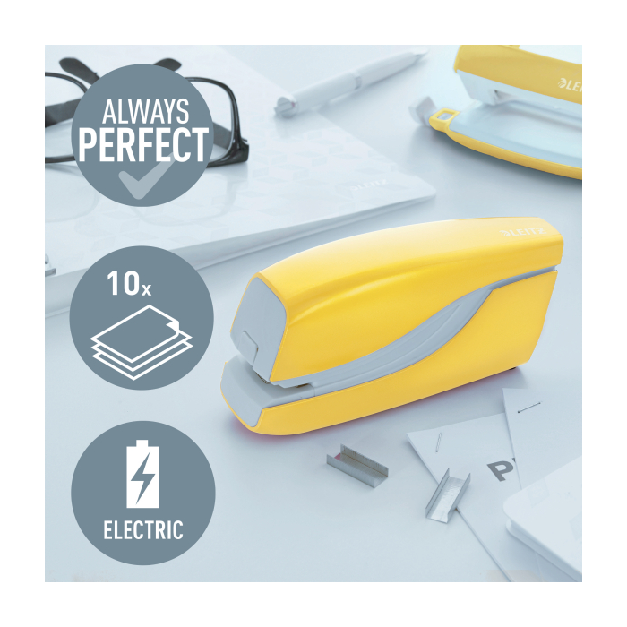 Elektrická zošívačka Leitz New NeXXt WOW. Vďaka jednoduchému ovládaniu jednou rukou je ideálna na časté používanie. Technológia s napájaním na batérie na zošívanie v pohybe. V žiarivých farbách WOW. Batérie (4× 1,5 V AAA LR03) nie sú súčasťou balenia. Kapacita 10 listov. Náhradné spinky ES556800. Farba žltá.