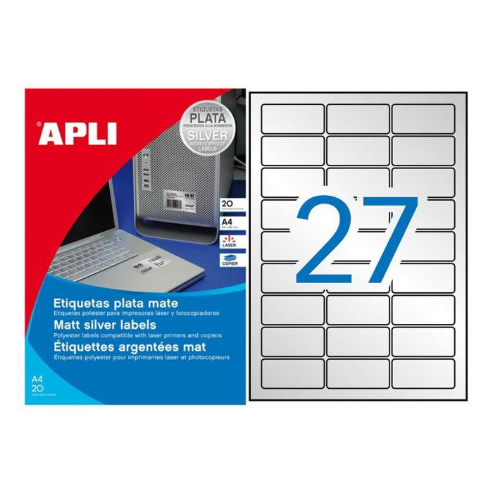 Polyesterové etikety odolné voči vplyvom počasia. Vhodné pre tlač v čiernobielych kopírkach a laserových tlačiarňach. Prevedenie metalizovaná strieborná. Rozmery: 63,5x29,6 mm Farba: strieborná