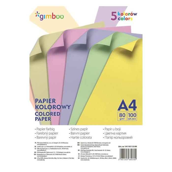 Farebný papier GIMBOO A4, 100 listov, 80 g, 5 pastelových farieb