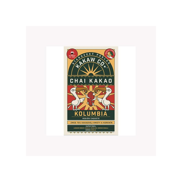 Kakao z regiónu Caqueté v Kolumbii je jemne osladené panelou a obohatené indickou protizápalovou zmesou korenín Chai. 70% tvorí čistá kakaová hmota. Zmes korenín Chai sa skladá z klinčeka, zázvoru, kardamonu, škorice, anízu a feniklu. Táto zmes pôsobí protizápalovo a výrazne posilňuje prirodzené protizápalové účinky kakaa.