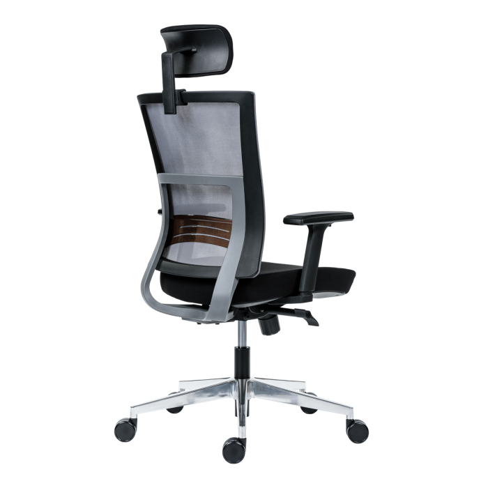 • kancelárska stolička s vysokým priedušným operadlom, opierkou hlavy, podrúčkami a molitánom sedáku zo studenej peny, synchrónny mechanizmus s nastavením sily protiváhy