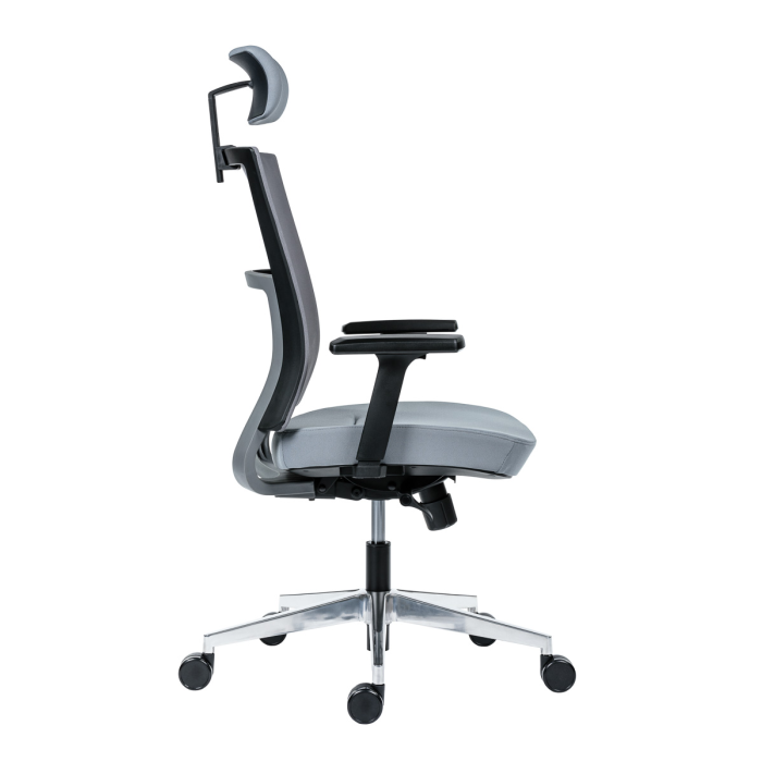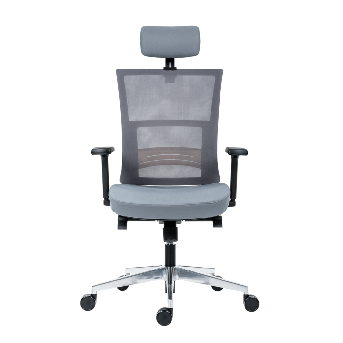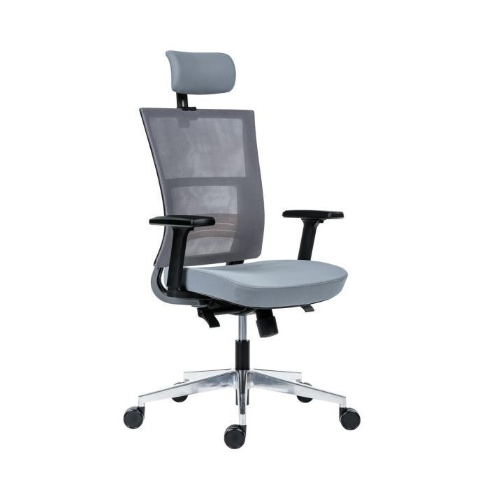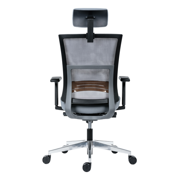• kancelárska stolička s vysokým priedušným operadlom, opierkou hlavy, podrúčkami a molitánom sedáku zo studenej peny, synchrónny mechanizmus s nastavením sily protiváhy