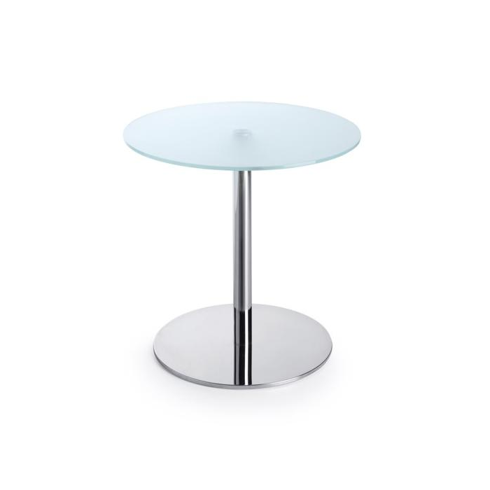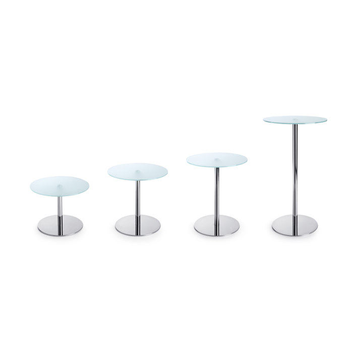 Minimalistický stolík SR 30 je navrhnutý s okrúhlou doskou, vyrobenou z tvrdeného mliečneho skla s hrúbkou 10 mm.