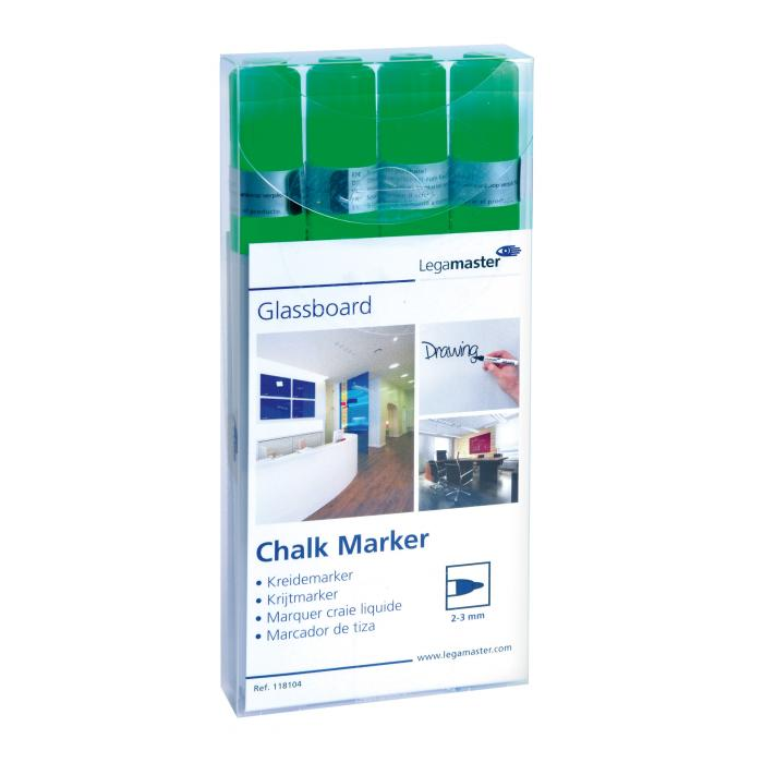Kriedové popisovače vhodné na sklenené tabule, okná a zrkadlá. Svietiace nepriehľadné farby bez zápachu, stierateľné vlhkou utierkou. Farba zelená. Balenie 4 ks.