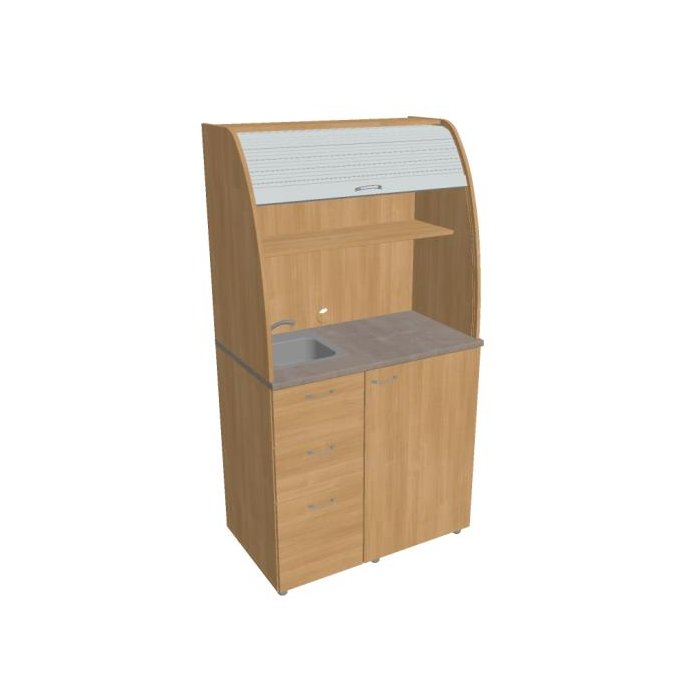 • Dve police vo vrchnej časti kuchynky poskytujú dostatočnú kapacitu na poháre, šálky a taniere. Na pracovnú dosku môžete umiestniť napr. kávovar a káblovou priechodkou v zadnej časti vyvediete kábel z priestoru kuchynky.