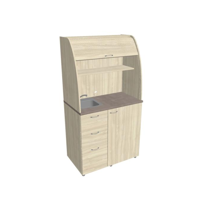 • Dve police vo vrchnej časti kuchynky poskytujú dostatočnú kapacitu na poháre, šálky a taniere. Na pracovnú dosku môžete umiestniť napr. kávovar a káblovou priechodkou v zadnej časti vyvediete kábel z priestoru kuchynky.