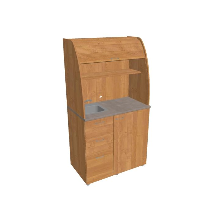 • Dve police vo vrchnej časti kuchynky poskytujú dostatočnú kapacitu na poháre, šálky a taniere. Na pracovnú dosku môžete umiestniť napr. kávovar a káblovou priechodkou v zadnej časti vyvediete kábel z priestoru kuchynky.