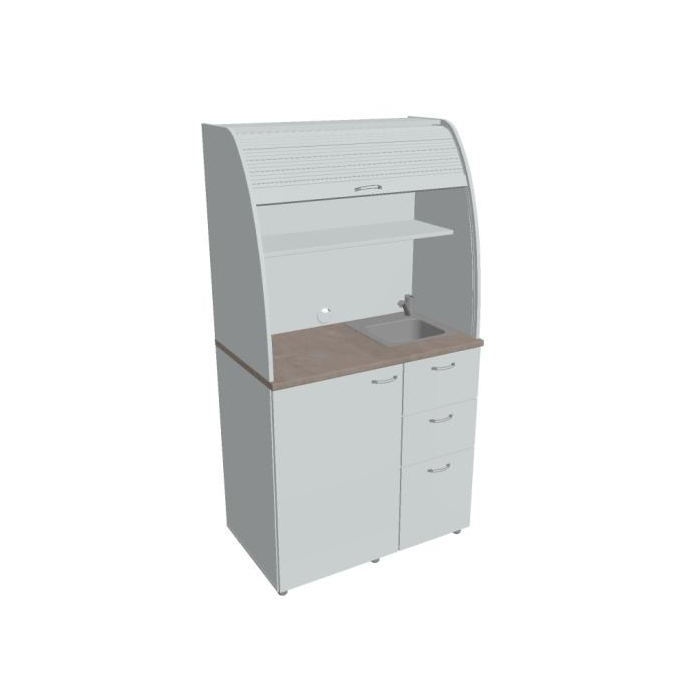 • Dve police vo vrchnej časti kuchynky poskytujú dostatočnú kapacitu na poháre, šálky a taniere. Na pracovnú dosku môžete umiestniť napr. kávovar a káblovou priechodkou v zadnej časti vyvediete kábel z priestoru kuchynky.