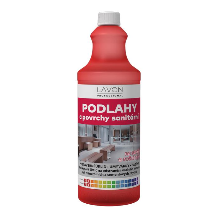 Lavon podlahy a povrchy sanitární 1 l, silne kyslý, nízkopenivý čistič na odstránenie vodného kameňa, hrdze, minerálnych a cementových zvyškov. Vhodný na dlažby, keramické obklady, umývadlá, vodovodné batérie, vane, pisoáre, WC misy, bazény.