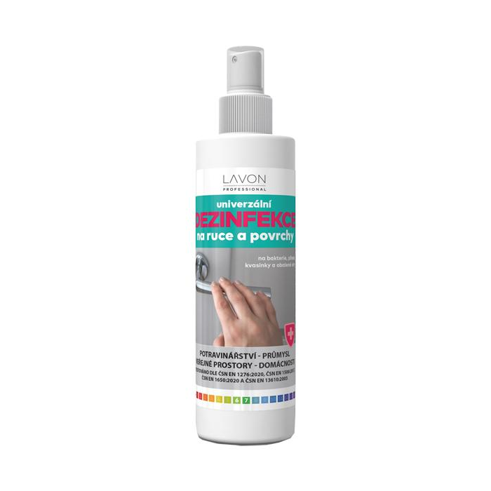 LAVON univerzálny dezinfekčný prostriedok na ruky a povrchy je biocídny výrobok na spotrebiteľské a profesionálne použitie v potravinárstve, priemysle, domácnostiach a verejných priestoroch. Je určený na dezinfekciu rúk, pracovných plôch alebo povrchov zariadení. Ako preventívne opatrenie používajte na miestach, ktoré prichádzajú často do kontaktu s rukami (držadlá, zábradlia, kohútiky atď.). Testované podľa noriem EN 1276:2020, EN 1500:2017, EN 1650:2020 a EN 13610:2003. Obsahuje 65 % alkoholu.