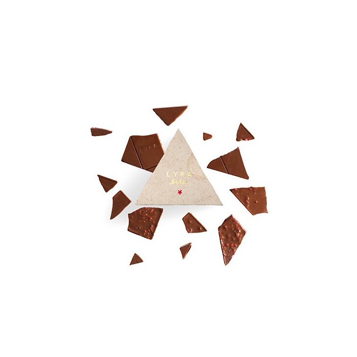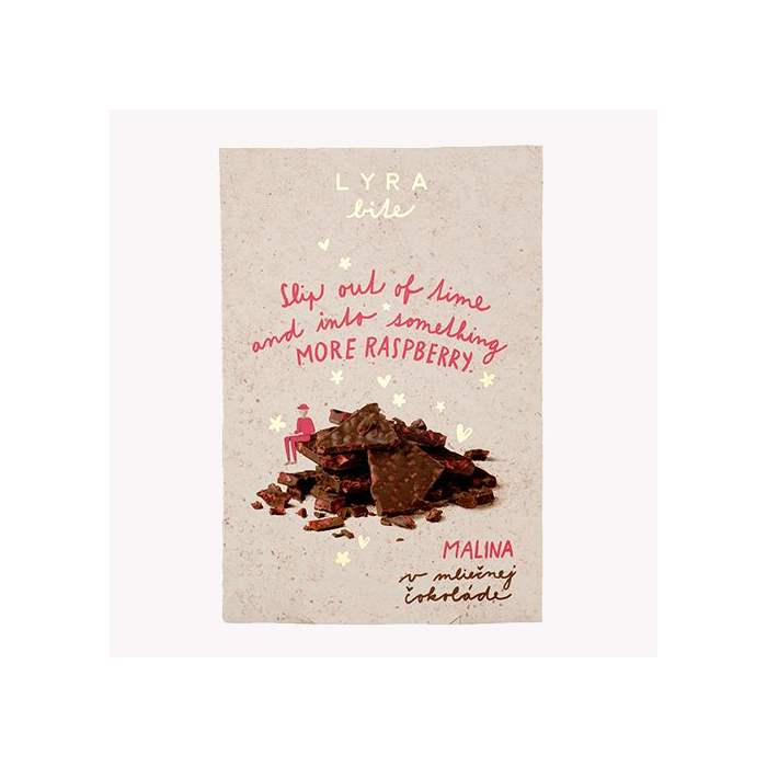 Zloženie: Mliečna čokoláda (95 %) - kakaové maslo, trstinový cukor, sušené mlieko, kakaová hmota. Lyofilizované maliny (5 %). Obsah kakaovej sušiny min. 50 %