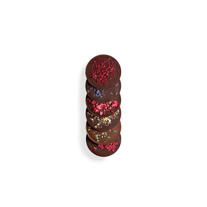 Zloženie: Horká čokoláda - trstinový cukor, kakaová hmota, kakaové maslo. Emulgátor: sójový lecitín. Aróma: prírodná vanilka. Mliečna čokoláda - trstinový cukor, sušené mlieko, kakaové maslo, kakaová hmota. Emulgátor: sójový lecitín. Aróma: prírodná vanilka. Možné posypy: lyofilizované jahody, višne, pomaranče, brusnice, kvety fialky v cukre, kvety ruže v cukre a listy mäty v cukre.