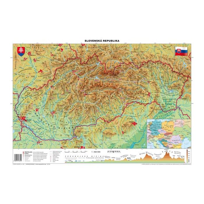 Nástenná mapa SR všeobecnogeografická je podrobne spracovaná. Na mape nájdete všetky pohoria, rieky, väčšie mestá a obce. Je vhodná na trvalé vyvesenie. Je obojstranne laminovaná, Dodávaná s bielymi lištami s úchytom na zavesenie.