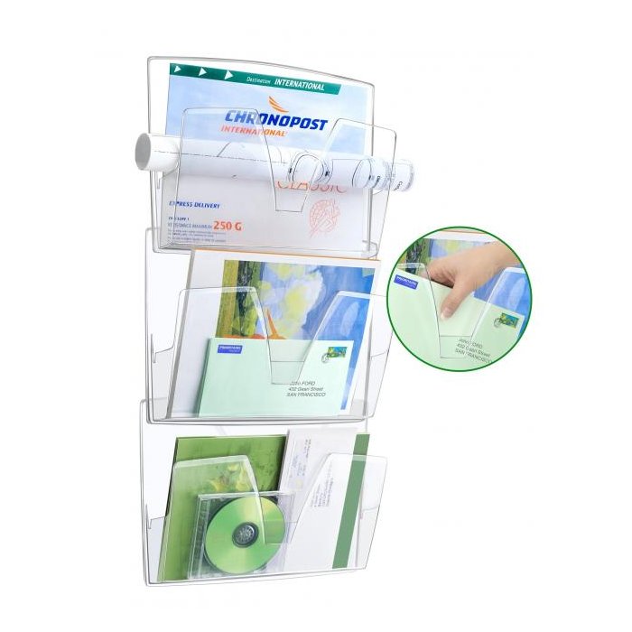 Panel s tromi odkladačmi na triedenie pošty pre dokumenty formátov do 24 × 32 cm s možnosťou zavesenia odkladačov spolu alebo každého separátne. Postranný „U“ rez udrží obálky A3+. Materiál nárazuvzdorný recyklovaný polystyrén. Rozmery jedného odkladača (š × v × h) 361 × 270 × 86 mm. Dodávané vrátane montážnych skrutiek. Farba číra.