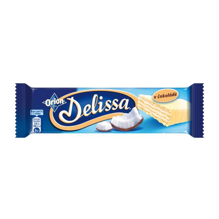 Biela čokoláda (cukor, kakaové maslo, sušené plnotučné mlieko, rastlinné tuky: palmový, shea; sušená mliečna srvátka, emulgátor: lecitíny; prírodná aróma), palmový olej, pšeničná múka, sušená mliečna srvátka, cukor, sušené kokos 2,3 %, kypriace látky (uhličitany amónne, uhličitany sodné), emulgátory (lecitíny, polyglycerylpolyricinoleát), prírodná aróma, jedlá soľ, Vedľa kakaového masla obsahuje biela čokoláda rastlinné tuky