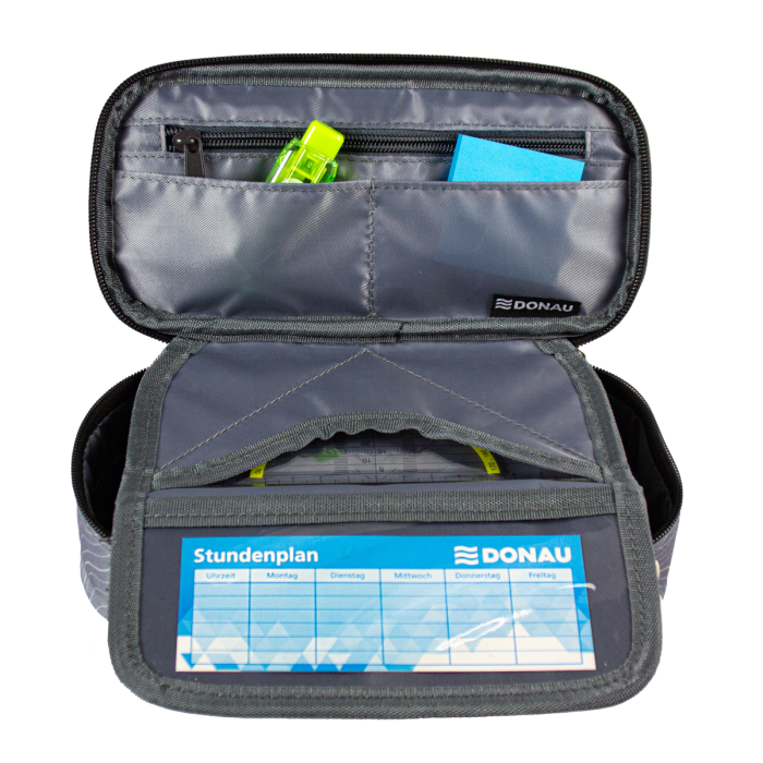 Peračník vyrobený z odolného polyesteru so zipsom. Vo vnútri sa nachádza priehradka na zips a dve praktické vrecká. Vnútorná chlopňa ponúka vrecko na štvorec a priehľadné okienko na rozvrh. Desať pútok na perá udrží veci poriadok. Peračník je prázdny.
