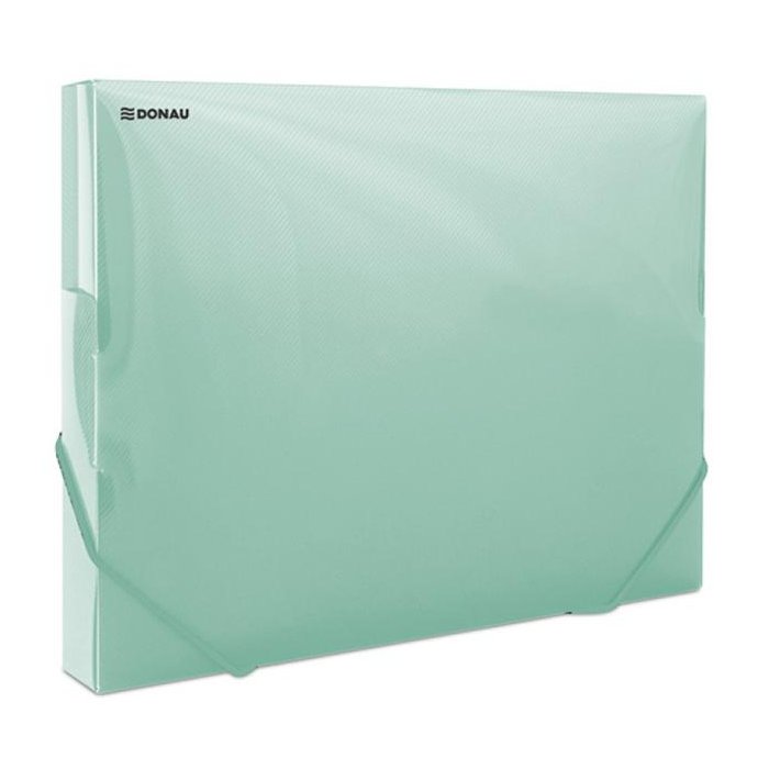 Plastový box s tromi chlopňami vyrobený zo silného polypropylénu 700 µm, uzatvárateľný gumičkou. Kapacita cca 300 listov. Rozmery (v×hך) 327×250×32 mm. Väčšie balenie 20 ks. Farba: zelená