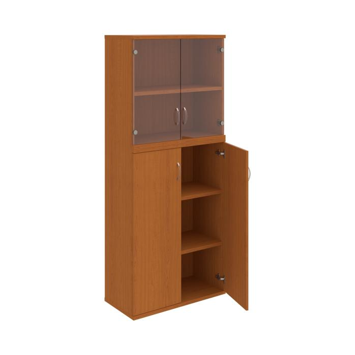 Kombinovaná skriňa - dvere/nika. Kancelárske skrine STRONG majú robustnú konštrukciu a vyššiu nosnosť políc ako bežné kancelárske skrine.V ponuke sú skriňové moduly s výškou 185 cm, 111 cm alebo 74 cm a šírky 80 cm alebo 40 cm. Hĺbka všetkých modelov skriňového radu STRONG je 40 cm.Chrbát, vyrobený z 8 mm hrubých dosák, je obojstranne pohľadový, takže skrine môžete použiť ako priestorový deliaci prvok. Hrúbka samotných políc je 25 mm, čo znamená nosnosť 80 kg na 1 policu.Korpusy, dvierka a police skríň sú olepené odolnou 2mm ABS hranou, ktorá garantuje dostatočnú ochranu proti poškodeniu.