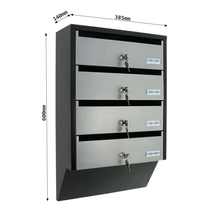 Predstavujeme poštovú schránku so zaujímavým úzkym dizajnom, ktorá je vhodná pre bytové domy alebo polyfunkčné objekty. V jednej schránke sú celkovo 4 priečinky so samostatnými menovkami a cylindrickým zámkom na kľúč. Jej dizajn pomôže ušetriť množstvo miesta, pričom jednotlivé priečinky sa otvárajú smerom nahor. Tento typ poštovej schránky môžete ľubovoľne rozširovať pridaním ďalších rovnakých schránok. Potrebný materiál na upevnenie na stenu je súčasťou balenia.