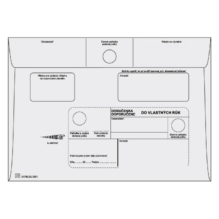 Biele papierové poštové obálky C5 s doručenkou do vlastných rúk - bez opakovaného doručenia rozmerov 162 × 229 mm s okienkom, popisom a lichobežníkovou klopou, 90 g/ m2. Balenie obsahuje 1000 ks.