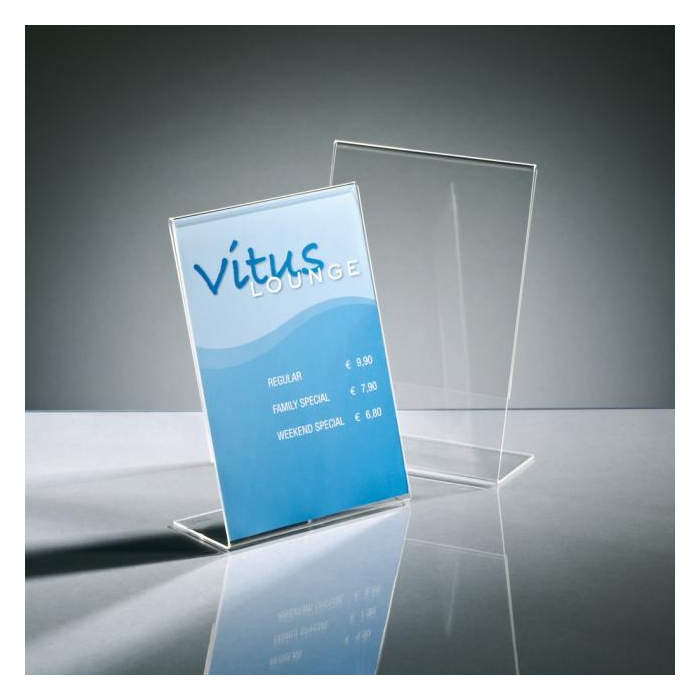 Univerzálny stojan odolný voči UV žiareniu v naklonenej verzii. Vhodný na výstavy, veľtrhy, ponukové listy, jedálne lístky a propagačné materiály. Vyrobený z kvalitného číreho akrylu, stabilný a pevný. Formát A4.
