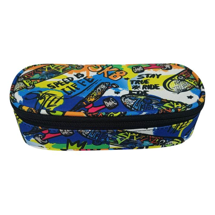 Oválny peračník na zips, 1 vnútorná chlopňa s pútkami na pero, bez náplne, materiál polyester. Rozmery: Š x V x H: 21 x 5,5 x 10,5 cm. Motív Skater.