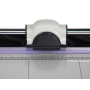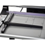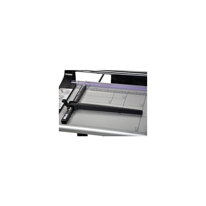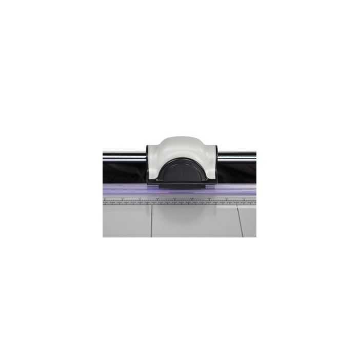 Kvalitná kotúčová rezačka s pevnou kovovou základňou a reznou hlavou umiestnenou na kovovej tyči. Základňa je vybavená natlačenými mierkami a posuvnou zarážkou, ktorá je súbežná s priamkou rezu.
