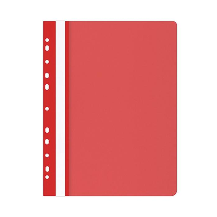 Rýchloviazač PP formátu A4 s priehľadnou prednou stranou a eurodierovaním. Farba matná červená.