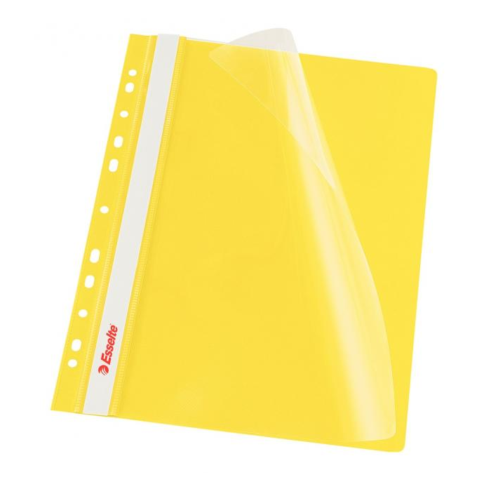 Obal s eurodierovaním z kvalitného PVC na uloženie dierovaných dokumentov do formátu A4. Predná strana priehľadná, pozdĺž chrbta biely obojstranný papierový zasúvací štítok. Rozmery 310 × 235 mm. Farba žltá.
