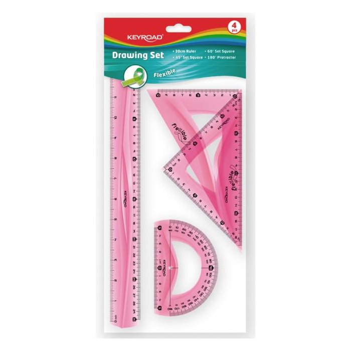Sada geometrických pomôcok užitočná pre každého študenta. Ohybná, s mierkou podľa noriem. Stredná sada: pravítko 30 cm, uhlomer 10 cm, 2 x trojuholník 13 a 18 cm. Farba: mix farieb.