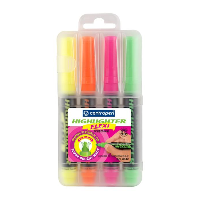 Veľkokapacitný zvýrazňovač so super pružným hrotom na hladké a pohodlné zvýraznenie textu na všetkých druhoch papiera. Sada 4 farieb. 95 % recyklovaného materiálu.