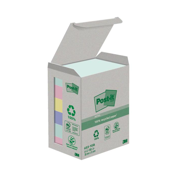 Samolepiaci bloček Post-it recyklované NATURE, pastelové farby, veľkosť 38x51 mm, 6 bločkov po 100 lístkov