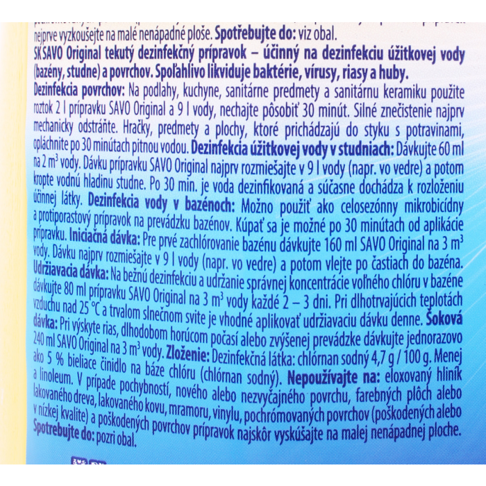PO POŽITÍ: Okamžite volajte TOXIKOLOGICKÉ INFORMAČNÉ CENTRUM/ lekára. Vypláchnite ústa, NEVYVOLÁVATE zvracanie. Pri kontakte s pokožkou (ALEBO VLASMI): Vyzlečte všetky kontaminované často odevu. Pokožku ihneď opláchnite vodou (alebo sprchou). PO ZASIAHNUTÍ OČÍ: Niekoľko minút ich opatrne vyplachujte vodou. Ak používate kontaktné šošovky a je to možné, odstráňte ich. Pokračujite vo vyplachovaní. Zozbierajte uniknutý produkt.Zneškodnite nádobu v súlade s platnou legislatívou, umiestnite prázdnu nádobu do komunálneho odpadu. Obsahuje chlóran sodný, hydroxid sodný.