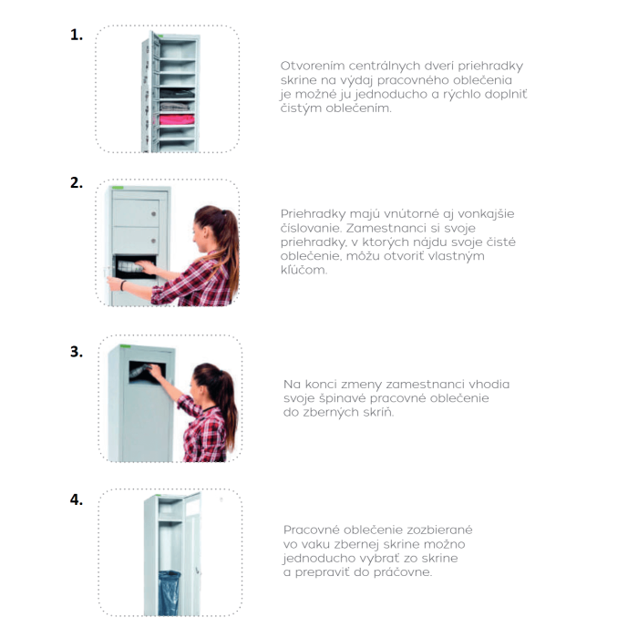 Vďaka skriniam na výdaj a zber pracovného oblečenia môžete mať na pracovisku ešte väčší poriadok. Pranie a rozdávanie odevov sa stáva veľmi jednoduchou záležitosťou.