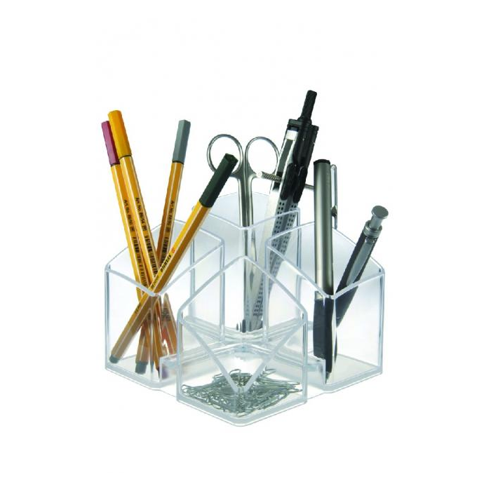 Stojan so 4 sekciami na písacie potreby a ďalšie kancelárske drobnosti. Spodná strana s protišmykovou úpravou. Materiál kvalitný plast vysokého lesku. Pri spojení 2 alebo 4 stojanov dosiahnete zaujímový moderný efekt. Rozmery 125 × 125 × 100 mm. Stojan dodávaný prázdny.