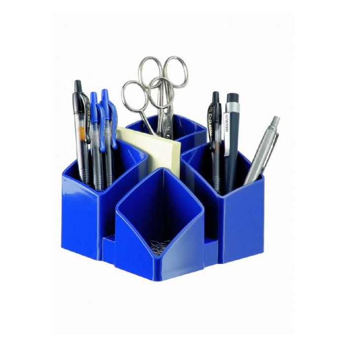 Stojan so 4 sekciami na písacie potreby a ďalšie kancelárske drobnosti. Spodná strana s protišmykovou úpravou. Materiál kvalitný plast vysokého lesku. Pri spojení 2 alebo 4 stojanov dosiahnete zaujímový moderný efekt. Rozmery 125 × 125 × 100 mm. Stojan dodávaný prázdny. Farba: modrá