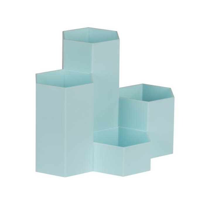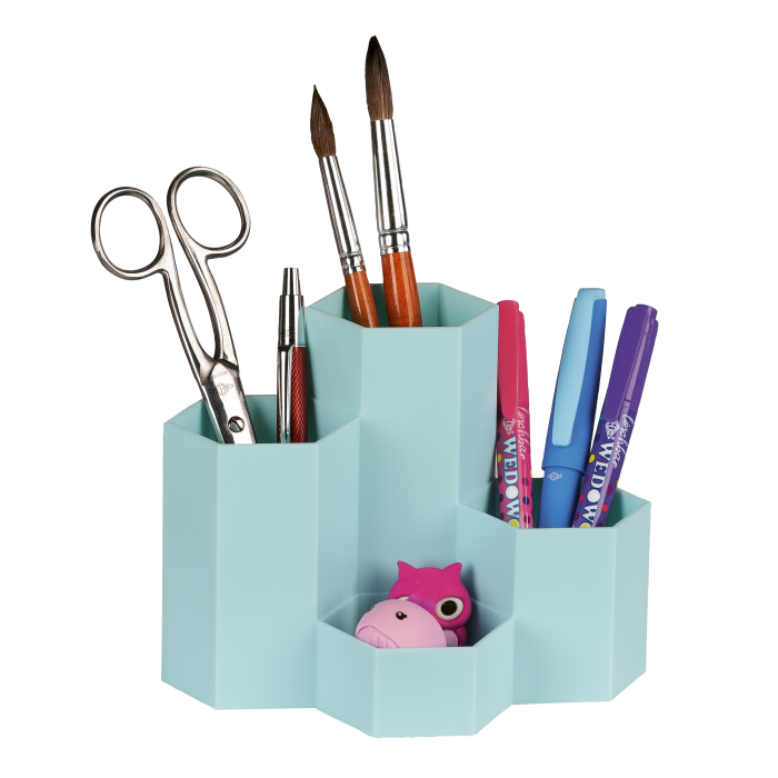 Stojan na perá so šesťuholníkovými trubicami je vyrobený z mimoriadne odolného a nárazuvzdorného polypropylénu. Vďaka tvaru včelieho plástu ho možno zoskupiť, aby sa ušetrilo miesto. 4 trubice, usporiadané v rôznych výškach, ponúkajú voľný priestor na pravítka, štetce, nožnice, perá a samozrejme aj na menšie predmety na stole, ako sú strúhadlá a gumy.