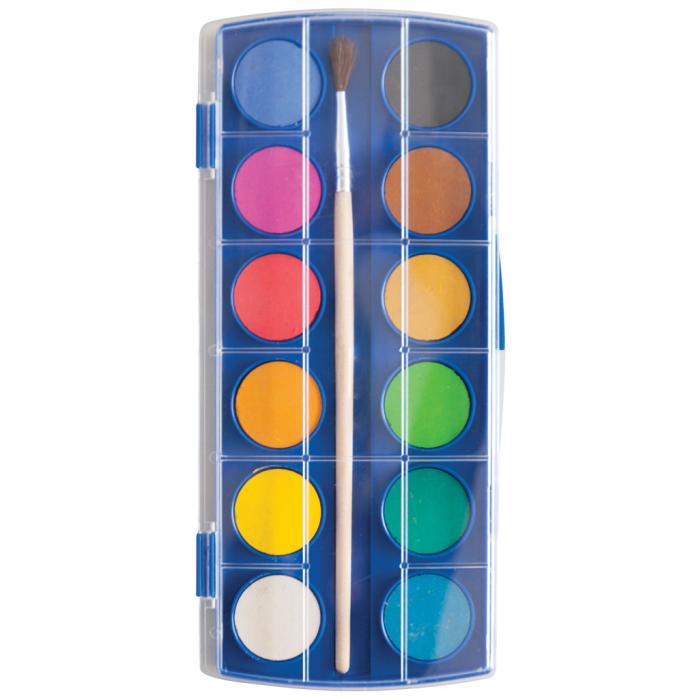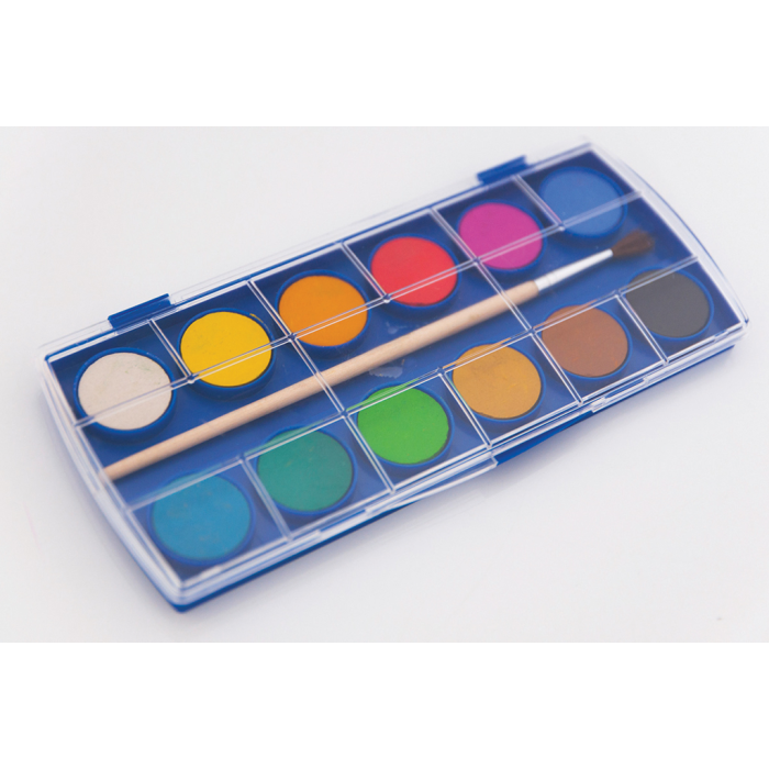 Školské akvarelové farby, v plastovej krabici, veľmi užitočné pri umeleckom vzdelávaní detí. Štetec v balení. 12 farieb.