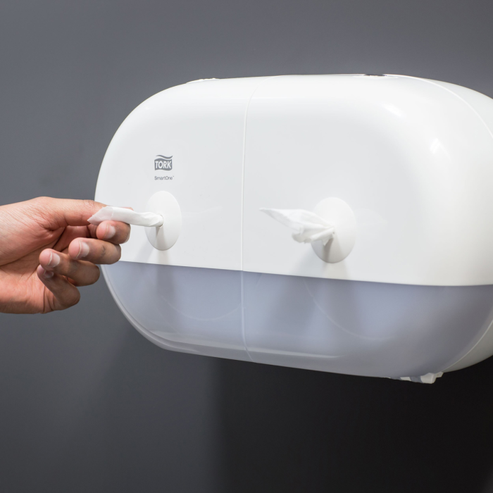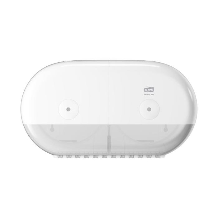 Tork SmartOne® Twin mini zásobník na toaletný papier v dizajne Elevation je moderný a efektívny systém zásobníkov vhodný pre náročné toalety a umyvárne s vysokou návštevnosťou. Tým, že sa doň zmestia dva kotúče, a dávkovaním po útržkoch, pomáha znižovať spotrebu až o 40 % v porovnaní s tradičnými jumbo kotúčovými zásobníkmi, čo znamená viac návštev na jeden kotúč. Zásobníky Tork Elevation majú praktický a moderný dizajn, ktorý zanecháva v hosťoch dlhodobý dojem.