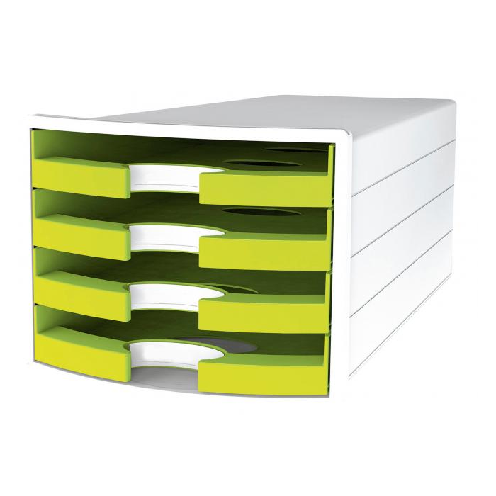 Box so štyrmi otvorenými zásuvkami v tvare počítačového monitora v trendových farbách. Rozmery (š × v × h) 294 × 235 × 368 mm. Farba zelená.