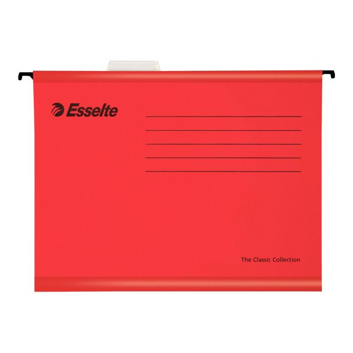 Závesné obaly Esselte kolekcie Classic vyrobené z pevného kartónu. Lisované dno obalu dovoľuje zvýšiť kapacitu na 30 mm. Súčasťou obalu je násuvný index z priehľadného plastu s výmenným papierovým štítkom. Formát A4, rozpätie vodiacich líšt 330 mm.