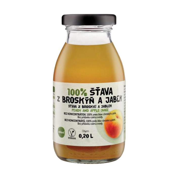 100 % zmes štiav bez alergénov a bez prídavku cukru a vody. Obsahuje iba prírodné cukry. Príchuť broskyňovo-jablková. Objem 0,2 l. Balenie 10 x 0,2 l.