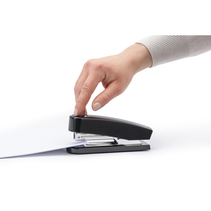 Ľahká zošívačka s kovovým zásobníkom a jednoduchým vedením spiniek. Kapacita náplne 100 spiniek 24/-6 alebo 150 spiniek 26/-6. Hĺbka zošívania 6,5 cm. Hmotnosť 175 g. Záruka 10 rokov. Farba: čierna Kapacita listov: 25 Hĺbka zošívania: 6,5 cm